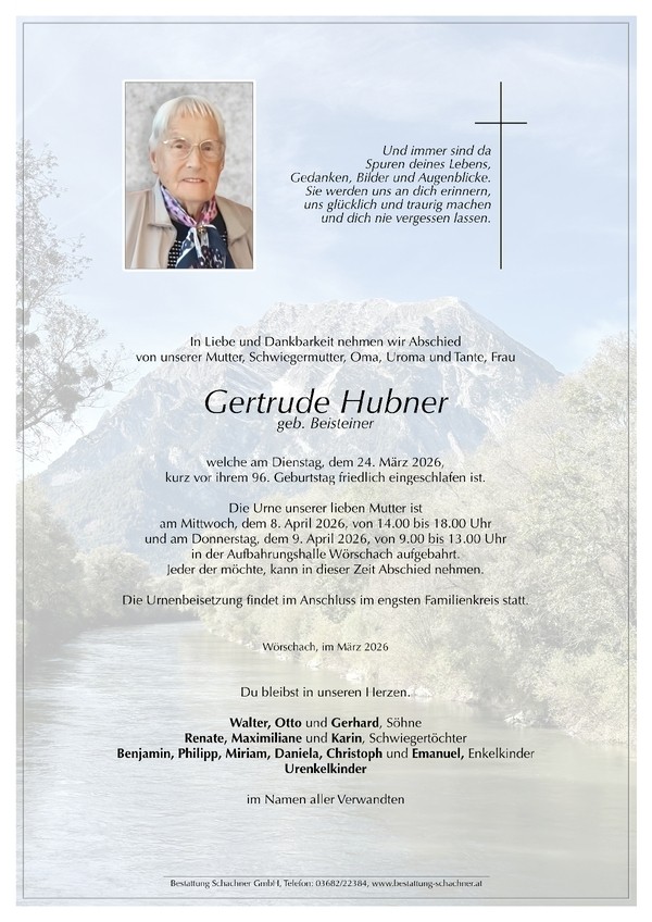 Aufbahrung der Urne am Mittwoch, dem 8.4.2026 von 14-18 Uhr und am Donnerstag, dem 9.4.2026 von 9-13 Uhr in der Aufbahrungshalle Wörschach.