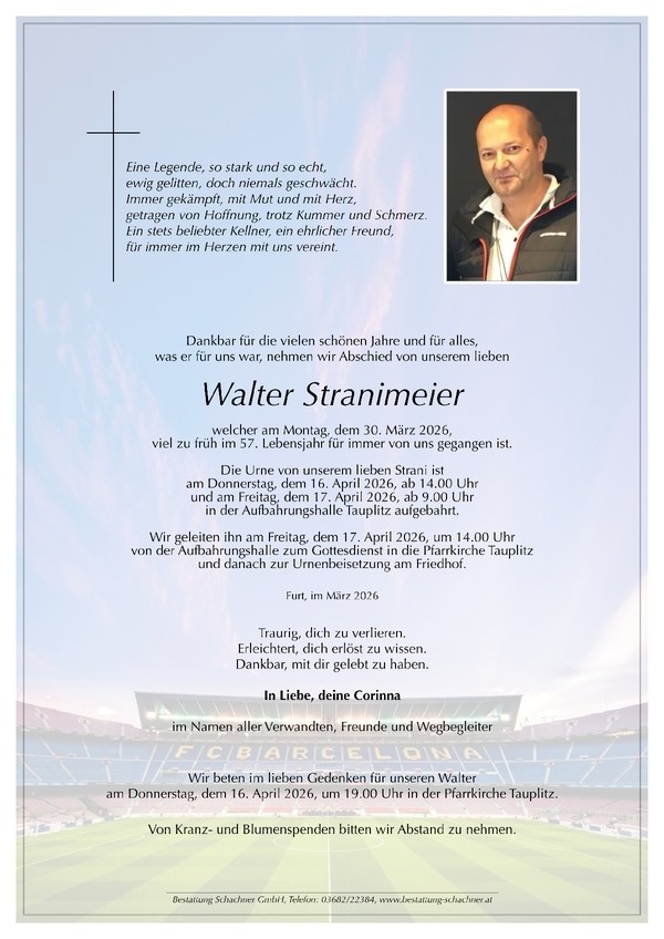 Aufbahrung der Urne ab Donnerstag, 16.4.2026 um 14 Uhr in der Aufbahrungshalle Tauplitz. Urnenbegräbnis am Freitag, dem 17.4.2026 um 14 Uhr in Tauplitz.