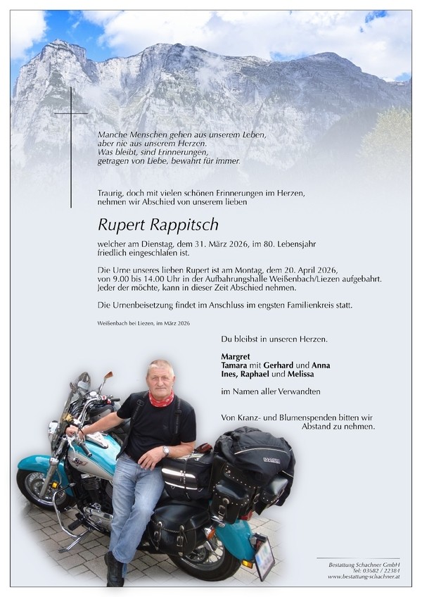 Aufbahrung der Urne am Montag, dem 20.4.2026 von 9-14 Uhr in der Aufbahrungshalle Weißenbach bei Liezen.